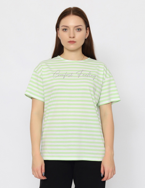 Футболка оверсайз из полосатого полотна, длиной до середины бедера, с разрезами по бокам. Рукав до локтя. Круглая горловина обработана обтачкой из основного полотна с изнанки изделия. Полочка декорирована принтом с использованием красок с блеском: "ощущение комфорта".