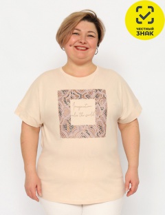 Футболка прямого силуэта удлиненная. Короткий цельнокройный рукав. Круглая горловина обработана узкой притачной обтачкой из рибаны с эластаном. Полочка декорирована принтом с использованием красок с блеском "воображение правит миром". Разрезы по бокам.