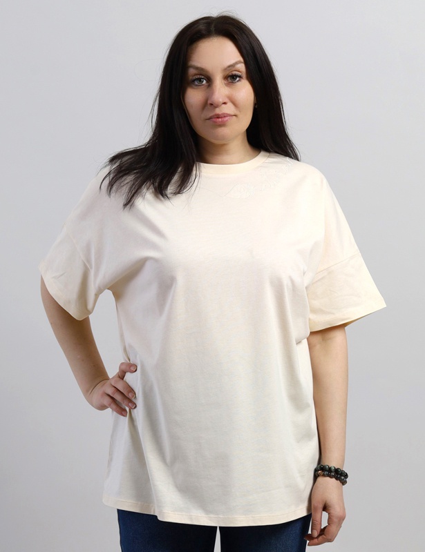 Футболка оверсайз длиной до бедер. Со спущенными плечами, рукав до локтя. Круглая горловина обработана узкой притачной обтачкой из рибаны с эластаном. Полочка декорирована вышивкой.