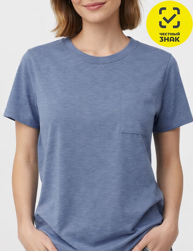 Футболка прямого силуэта со спущенным плечом. Полотно флам эффект(неравномерная пряжа). По низу рукава притачной манжет с отворотом и закрепками . На груди с левой стороны накладной карман. Круглая горловина обработана притачной обтачкой из рибаны с эластаном. Горловина спинки закрыта экстрафорной тесьмой
