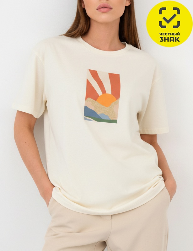 Футболка свободного силуэта со спущенным плечом. На полочке принт выполнен в комбинированной технике с применением металлической краски. Круглая горловина обработана притачной обтачкой из рибаны с эластаном. Горловина спинки закрыта экстрафорной тесьмой.
