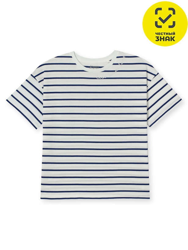 Футболка из полотна в вывязанную полоску (рингель) свободного силуэта, рукав до локтя на спущенном плече. Горловина обработана притачной обтачкой из рибаны с эластаном. Горловина спинки закрыта экстрафорной тесьмой. У горловины принт металлической краской "ЖИВИ УЧИСЬ ЛЮБВИ".