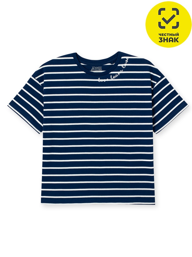 Футболка из полотна в вывязанную полоску (рингель) свободного силуэта, рукав до локтя на спущенном плече. Горловина обработана притачной обтачкой из рибаны с эластаном. Горловина спинки закрыта экстрафорной тесьмой. У горловины принт металлической краской "ЖИВИ УЧИСЬ ЛЮБВИ". Футболка