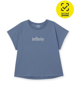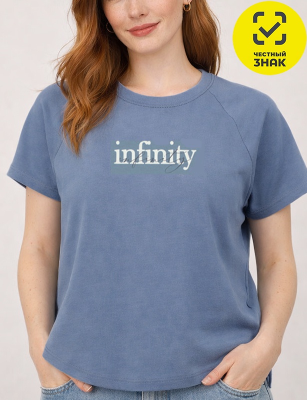 Футболка среднего объема с рукавом реглан. Спинка длиннее полочки с закруглением к боковым швам. Горловина обработана притачной обтачкой из рибаны с эластаном, по горловине отстрочка. Горловина спинки закрыта экстрафорной лентой. На полочке принт"БЕСКОНЕЧНОСТЬ".