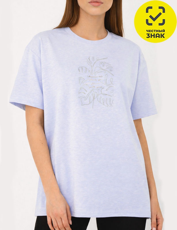 Футболка свободного силуэта из полотна с ФЛАМ эффектом(неравномерная пряжа). Рукав до локтя на спущенном плече. Горловина обработана притачной обтачкой из рибаны с элачстаном. Горловина спинки закрыта экстрафорной тесьмой. На полочке принт с применением металлической краски "ГДЕ БЫ НЕ ПРОИЗРАСТАЛА ЖИЗНЬ ВСЕ РАСЦВЕТАЕТ С ИЗЯЩЕСТВОМ"
