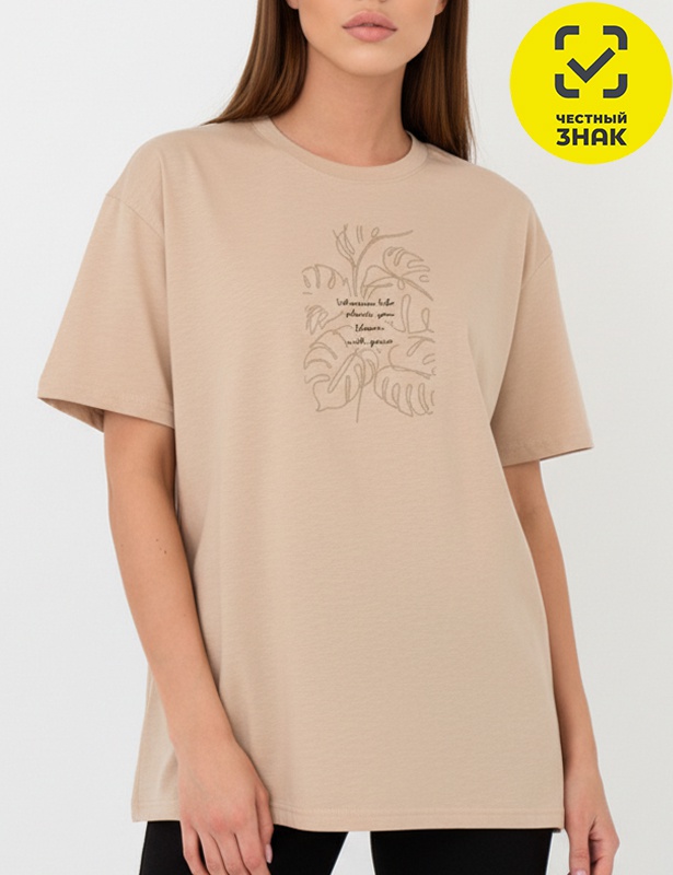 Футболка свободного силуэта из полотна с ФЛАМ эффектом(неравномерная пряжа). Рукав до локтя на спущенном плече. Горловина обработана притачной обтачкой из рибаны с элачстаном. Горловина спинки закрыта экстрафорной тесьмой. На полочке принт с применением металлической краски "ГДЕ БЫ НЕ ПРОИЗРАСТАЛА ЖИЗНЬ ВСЕ РАСЦВЕТАЕТ С ИЗЯЩЕСТВОМ"