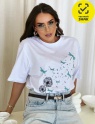 Футболка женская с короткими рукавами, свободного силуэта. Горловина круглая, обработана притачной бейкой. Перед футболки декорирован принтом.