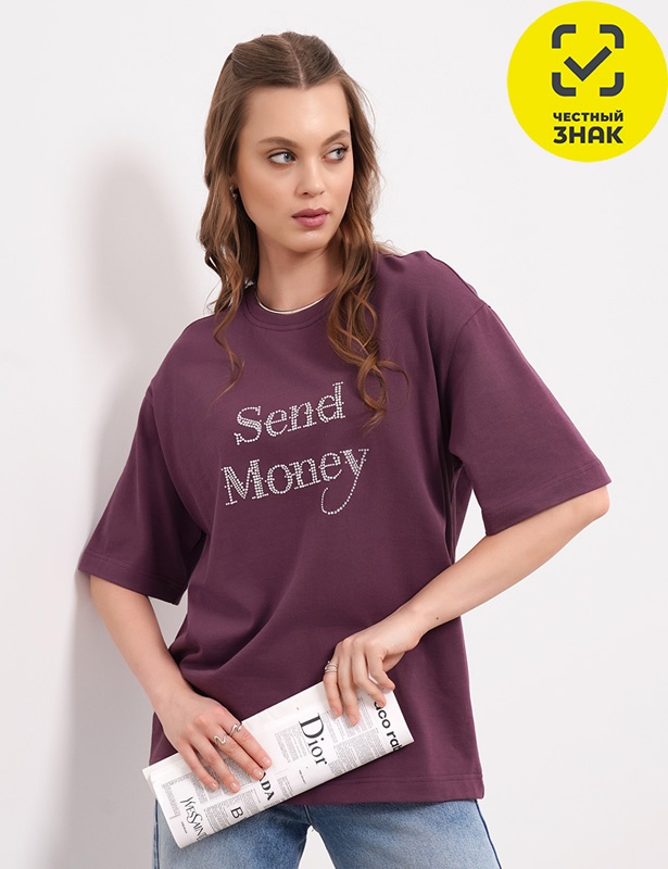 Футболка оверсайз из хлопкового трикотажного полотна. Короткий спущенный рукав. Округлая горловина с обтачкой из рибаны. По спинке средний шов. По переду термостразы.