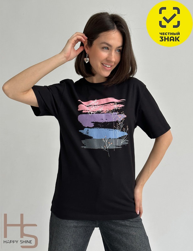 Футболка женская с короткими рукавами, свободного силуэта. Горловина круглая, обработана притачной бейкой. Перед футболки декорирован принтом.