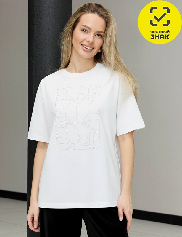 Футболка женская из гладкокрашенного трикотажного полотна «кулирка с лайкрой», свободного покроя, с короткими втачными рукавами, горловиной овальной формы, обработанной втачной планкой. По центру полочки выполнена вышивка «пайетками» в тон изделия