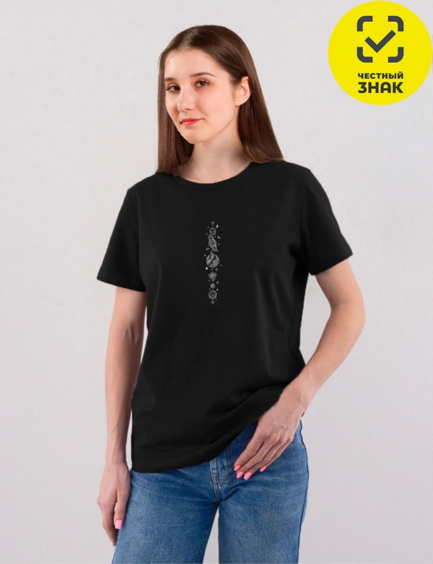 Женская футболка свободного кроя с короткими втачными рукавами, округлой горловиной и печатью на полочке — это классическая модель, подходящая для любого времени года и стиля одежды.