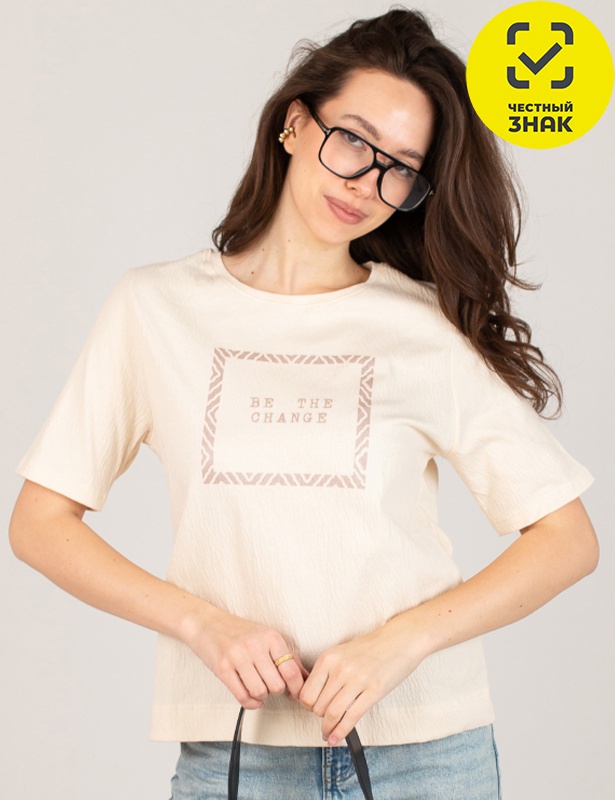 Футболка женская из ткани жатка, с короткими рукавами, свободного силуэта. Горловина круглая, обработана притачной бейкой. Перед футболки декорирован принтом.