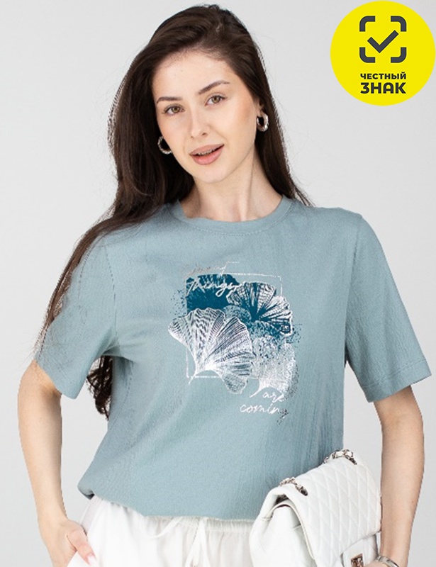 Футболка женская с короткими рукавами, свободного силуэта. Горловина круглая, обработана притачной бейкой. Перед футболки декорирован принтом.