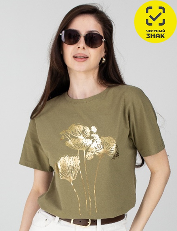 Футболка женская с короткими рукавами, свободного силуэта. Горловина круглая, обработана притачной бейкой. Перед футболки декорирован принтом.