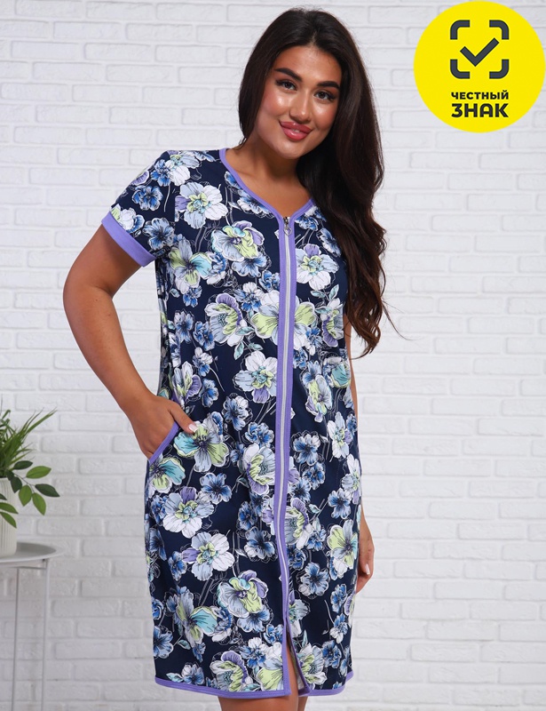 Халат женский из трикотажного полотна (кулирка набивная-реактив). Отделка: обтачки на рукавах и окантовка, из однотонной кулирки. Халат на молнии, свободного кроя, длина до колена фигурный вырез у горловины, карманы накладные, полукруглые, в боковых швах, рукав втачной, короткий с обтачкой.