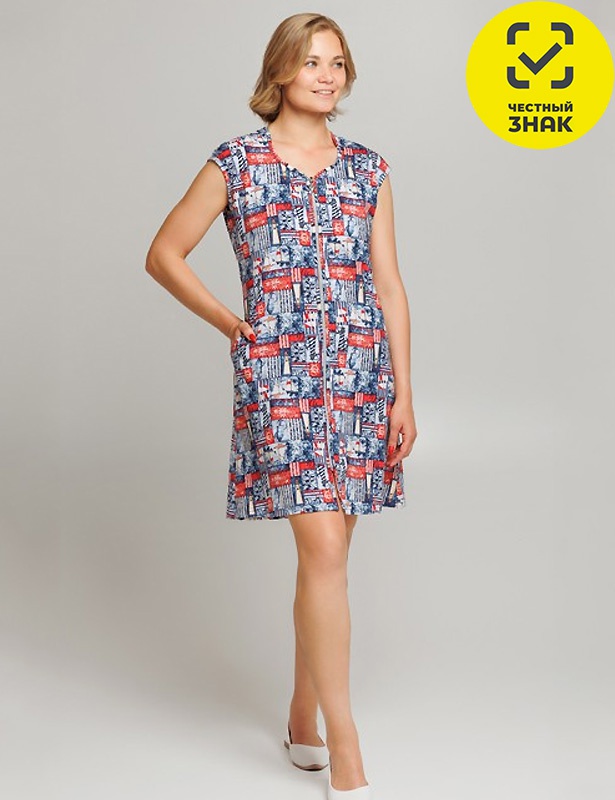 Халат женский из набивного полотна, длиной выше колена, центральная застежка на молнию и округлый вырез горловины окантованы бейкой.