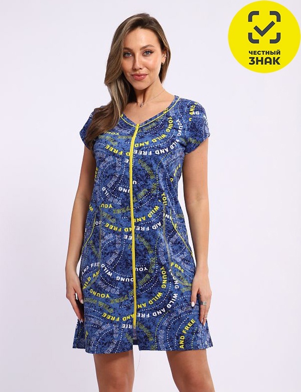 Женский халат из набивной кулирки с застежкой на молнии. Модель с короткими рукавами и практичными карманами по бокам. Длина изделия - чуть выше колен, что делает его удобным для повседневной носки.