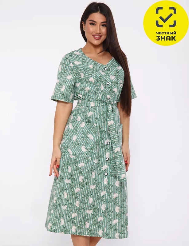 Женский халат полуоблегающего силуэта на пуговицах, короткий втачной рукав, фигурные кокетки, оформленные диагональным настилом полотна, накладные карманы, по талии на поясе.