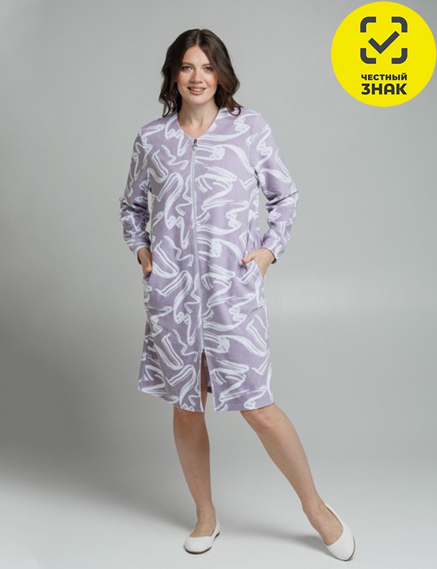 Халат женский махровый, с длинными втачными рукавами, на центральной застежке на молнию, карманы по бокам, декорирован абстрактным рисунком.
