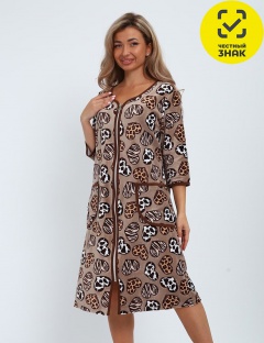 Халат женский на молнии из набивного велюра. Отделка - кулирка однотонная. Втачной рукав 3/4, накладные карманы.