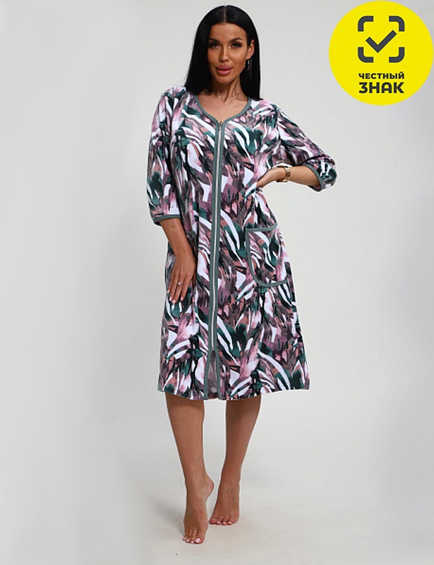 Халат женский на молнии из набивного велюра. Отделка - кулирка однотонная. Втачной рукав 3/4, накладные карманы.