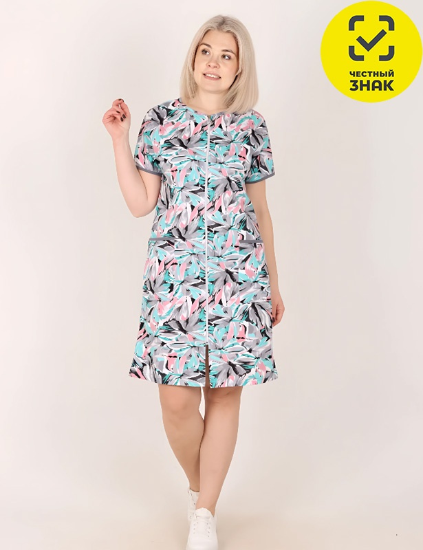Хлопковый халат с удобной застежкой-молнией, короткими цельнокроеными рукавами, двумя накладными карманами. Горловина, срезы карманов и рукавов окантованы бейкой.
