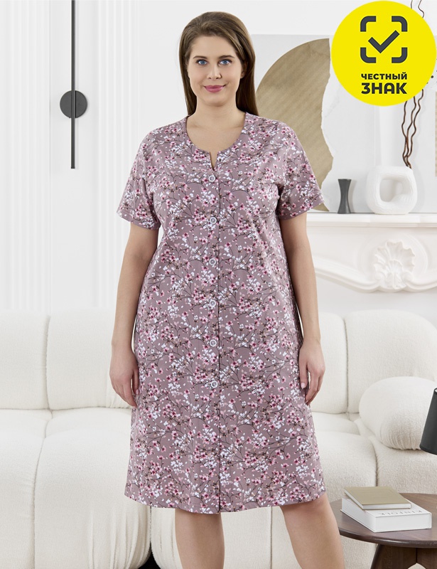 Халат женский из трикотажного полотна «кулирка» с набивным рисунком, прямого силуэта, с короткими втачными рукавами, карманами в боковых швах и центральной бортовой застежкой на обметанные петли и пуговицы. Горловина – овальной формы, переходящая в небольшой v-образный вырез выше верхней пуговицы. Входы в карманы и горловина спинки окантованы.