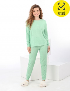 Костюм молодежный из трикотажного синтетического полотна, имитирующего кашемир, состоящий из джемпера и брюк. Джемпер – свободного покроя, с длинными втачными рукавам с притачными манжетами и горловиной овальной формы, обработанной втачной планкой. Брюки – длинные, свободного покроя, с эластичной тесьмой по талии и притачными манжетами по низу.
