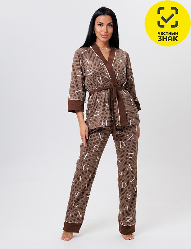 Домашний костюм из кулирки состоит из брюк и туники на запах с поясом. Обтачка туники, низ рукавов и низ брюк выполнены из полотна контрастного цвета с отделкой кантом.