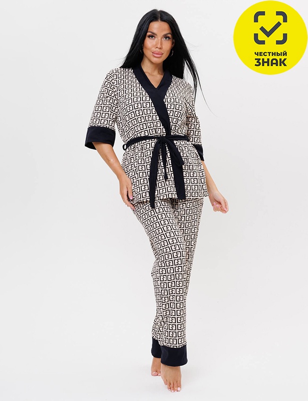 Домашний костюм из кулирки состоит из брюк, майки и туники на запах с поясом. Обтачка туники, низ рукавов и низ брюк выполнены из полотна контрастного цвета с отделкой кантом. Майка однотонная на бретелях.