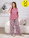 Костюм женский из трикотажного полотна «кулирка» в комбинации двух видов в единой цветовой гамме: гладкокрашеный и с набивным рисунком, состоящий из футболки и брюк. Футболка – из гладкокрашеного полотна, с короткими втачными рукавами, горловиной овальной формы, обработанной притачной планкой и принтом на полочке, выполненным в технике «шелкографии». Брюки – из набивного полотна, свободного покроя, на притачном поясе с эластичной тесьмой внутри и карманами в боковых швах.