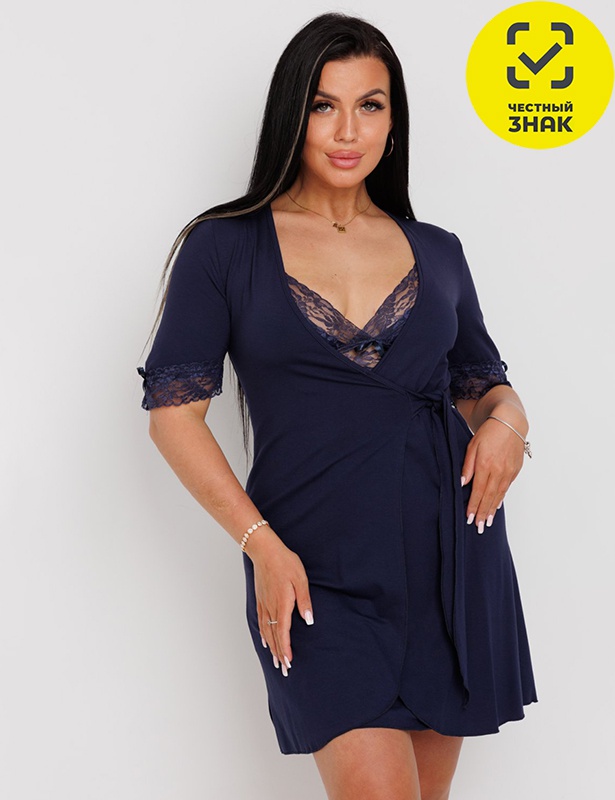 Пеньюар женский состоит из 2-х предметов. Сорочка из мягкой вискозы на тонких бретелях, V-образный вырез горловины декорирован кружевом, сборка по линии груди украшена кружевом. Боковые разрезы по низу изделия. Халат запашной из вискозы, на поясе, рукава длиной до локтя, срезы рукавов декорированы кружевом.