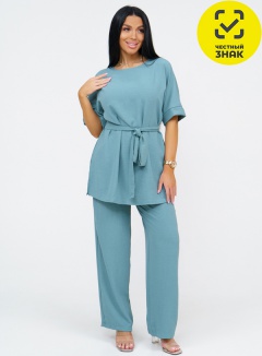 Легкий костюм из жатки, состоящий из брюк и туники со спущенным плечом. Брюки с карманами и отстроченным поясом. В боковых швах туники разрезы, срезы рукавов обработаны манжетами. В комплекте пояс.