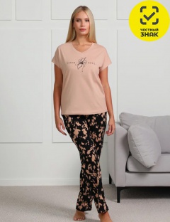 Костюм женский из трикотажного полотна «кулирка» в комбинации двух видов: с набивным рисунком и гладкокрашенного, состоящий из футболки и брюк. Футболка - из гладкокрашеного полотна, классического покроя, с цельнокроеными рукавами, горловиной V- образной формы и принтом на полочке, выполненным в технике «шелкографии». Горловина обработана втачной планкой из основного материала.Брюки - из полотна с набивным рисунком, свободного покроя, с карманами в боковых швах, на притачном поясе с эластичной тесьмой внутри.
