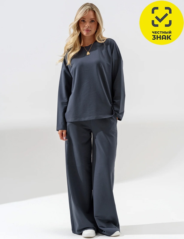 Костюм женский "Палаццо", состоящий из джемпера и брюк, выполнен из футера без начеса. Джемпер свободного кроя, с длинными рукавами и округлой горловиной. Брюки палаццо с высокой посадкой и широкими штанинами.