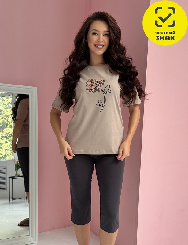Комплект женский: футболка и бриджи из мягкого трикотажа. Футболка гладкокрашеная прямого свободного силуэта, с коротким рукавом, длинной ниже середины бедра. Горловина круглая, из рибаны. На полочке выполнена шелкография. Бриджи ниже колена без боковых швов с поясом на резинке из гладкокрашеного полотна.