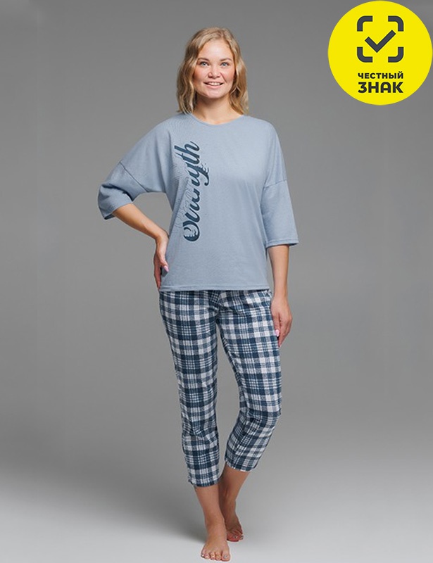 Комплект женский из трикотажного полотна «кулирка», состоящий из футболки и бридж. Футболка свободного кроя, с округлой горловиной, со спущенным плечом, с втачными рукавами длиной до локтя, с принтом на полочке. Бриджи из набивного полотна, на поясе на резинке.