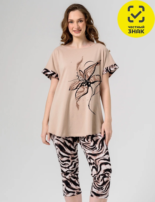 Комплект женский состоит из 2-х предметов. Футболка с коротким рукавом, округлой горловиной, на полочке принт. Бриджи облегающие на поясе на резинке.