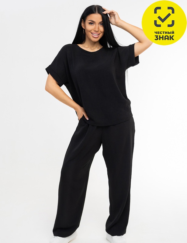 Костюм женский свободного силуэта, состоящий из футболки с коротким рукавом и брюк модели - шаровары. Верх с округлым вырезом горловины и целькроеным рукавом с манжетой. На спинке деокративная застежка на пуговицы. Брюки с широким поясом на резинке, для надежной фиксации на уровне талии и повышенного комфорта при носке, а так же удобными карманами с отрезным бочком.