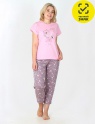 Женская трикотажная пижама, состоящая из футболки и укороченных брюк. Футболка прямая с цельнокроеным коротким рукавом. На футболке расположен романтический принт. Брюки с эластичной тесьмой на поясе.