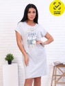 Сорочка женская из гладкокрашеного кулирного полотна, с коротким цельнокроеным рукавом, округлый вырез горловины окантован бейкой из основного полотна, на полочке печать, длина до колена.