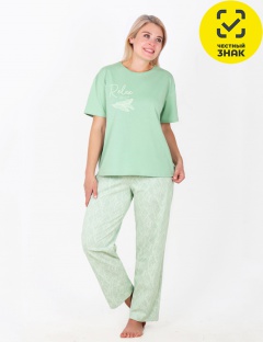 Комфортная модель пижамы из хлопка состоит из 2-х предметов. Футболка свободного силуэта со спущенным рукавом с принтом на груди. Брюки с мягким эластичным поясом на резинке.
