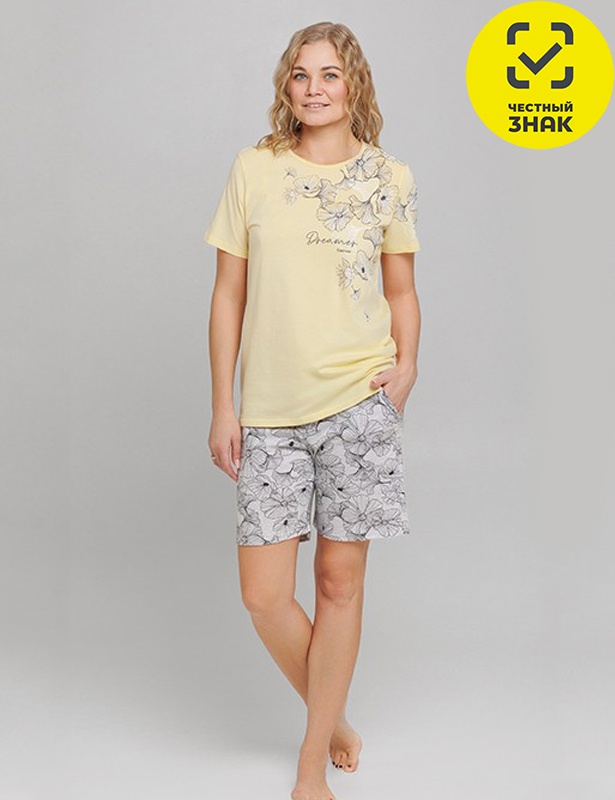 Пижама женская состоит из футболки и шорт. Футболка с короткими рукавами, округлой горловиной, декорирована принтом. Шорты из набивной кулирки на поясе на резинке, карманы по бокам.