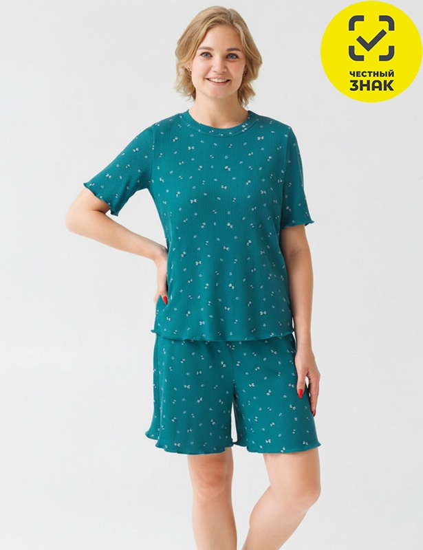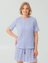 Женская пижама, состоящая из футболки и шорт, изготовлена из хлопкового набивного полотна «лапша». Футболка прямого кроя с короткими рукавами и округлым вырезом горловины. Шорты свободного кроя с эластичной резинкой на поясе. Пижама идеально подходит для отдыха и сна.