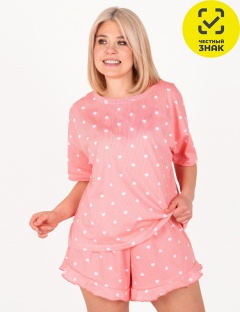 Пижама с шортами и футболкой — идеальный выбор для комфортного отдыха и сна. Свободный крой футболки делает каждое движение естественным и легким. Шорты с эластичной резинкой на талии и рюшей по низу.