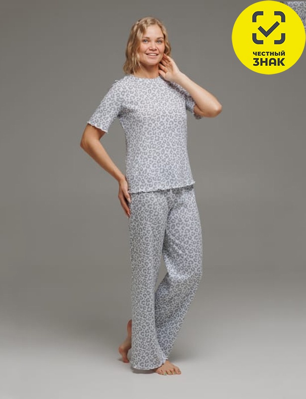 Женская пижама, состоящая из футболки и штанов, изготовлена из ткани кашкорсе. Футболка прямого кроя с короткими рукавами и округлым вырезом горловины. Штаны свободного кроя с эластичной резинкой на поясе. Пижама идеально подходит для отдыха и сна.