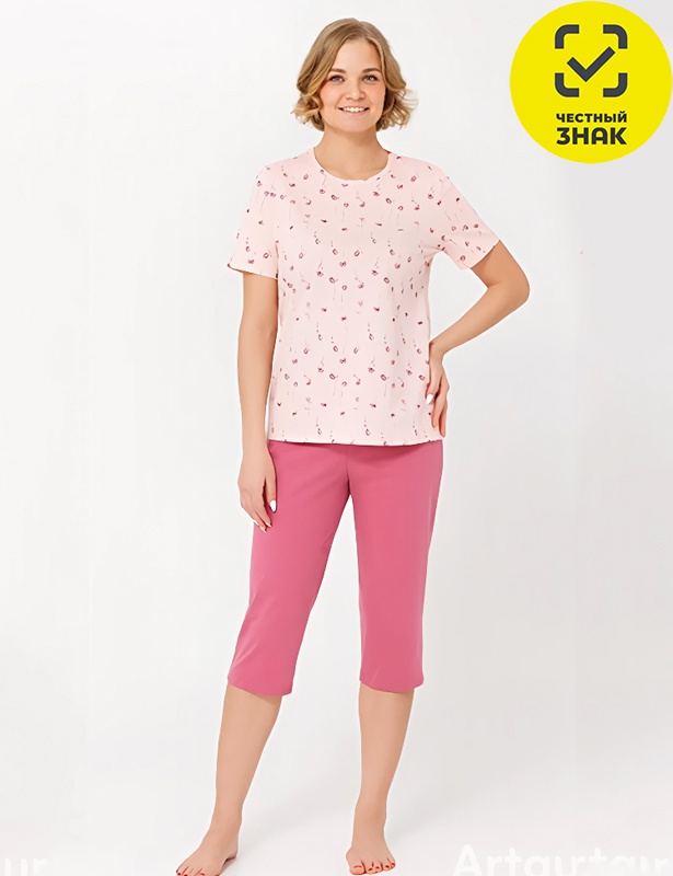 Женская пижама состоит из футболки и бридж. Футболка свободного кроя, короткий втачной рукав, округлый вырез горловины. Бриджи на поясе с резинкой.