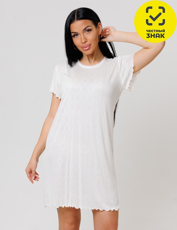Ночная сорочка из вискозы, с короткими рукавами и округлой горловиной. Особенностью изделия является декоративное оформление срезов рукавов и нижнего края волнистым швом.