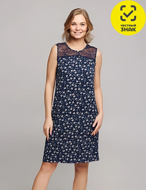 Сорочка женская из набивной вискозы, без рукавов, с широким плечом, округлый вырез горловины, кокетка со сборкой и декорирована кружевом.