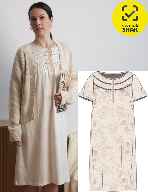 Ночная сорочка прямого кроя с короткими рукавами. Украшена декоративной планкой и лёгким принтом. Практичная и удобная модель для сна и отдыха.